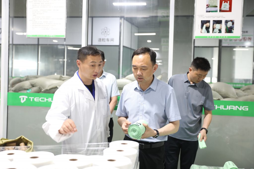 宋一兵一行首先參觀了公司的現代化展廳,一系列生物可降解制品琳瑯滿目,從生物改性原材料到可降解制品,每一款產品都凝聚了河南特創生物的智慧與汗水。宋一兵一行對我公司在技術創新和市場應用方面的成就表示高度贊賞。