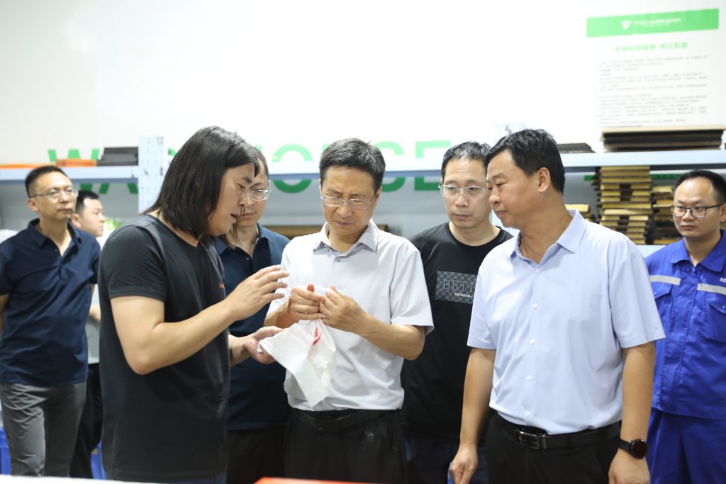 隨后,郜善軍一行又來(lái)到了河南特創(chuàng)現(xiàn)代化生產(chǎn)車間,近距離參觀了可降解制品的生產(chǎn)流程,并對(duì)公司高效的生產(chǎn)流程與嚴(yán)格的管理體系表示贊賞。郜善軍表示,在全省禁塑政策推動(dòng)下,河南特創(chuàng)應(yīng)把握機(jī)遇,提升產(chǎn)能,優(yōu)化產(chǎn)品,為禁塑工作提供有力支持。